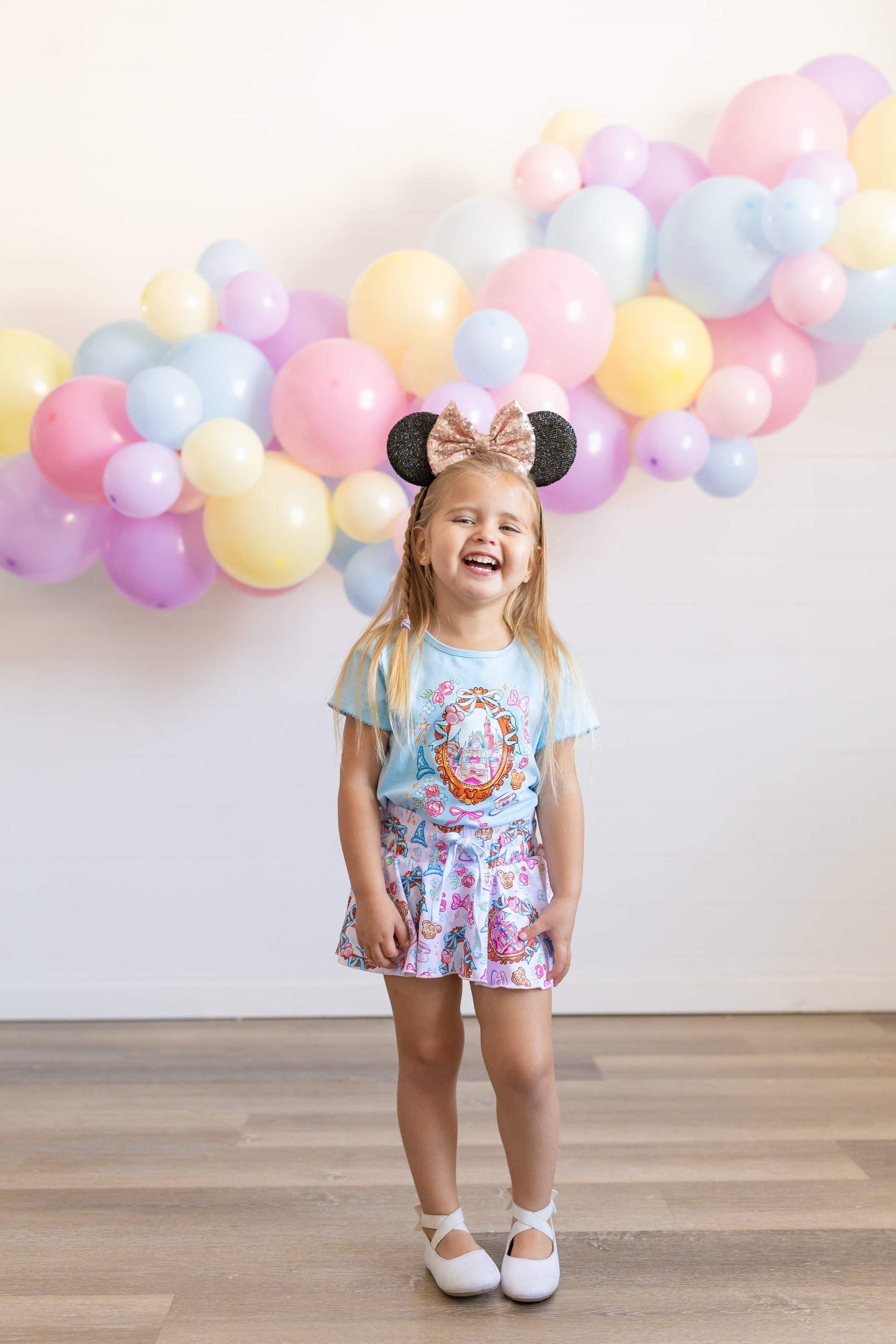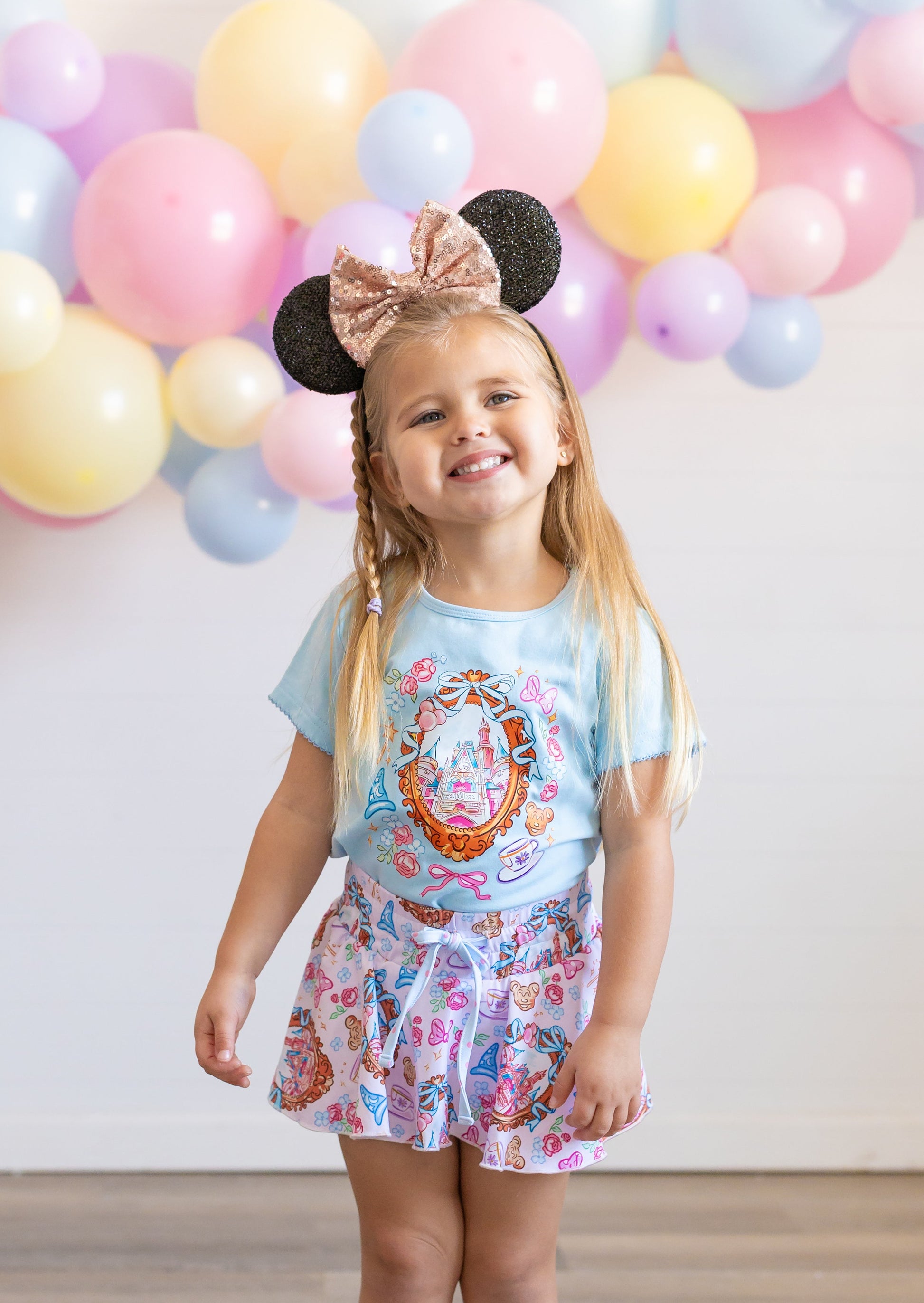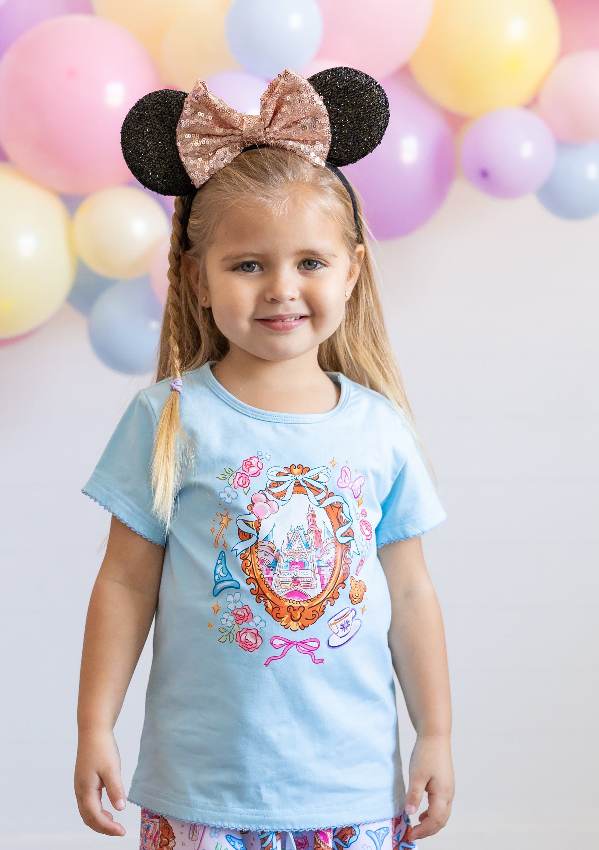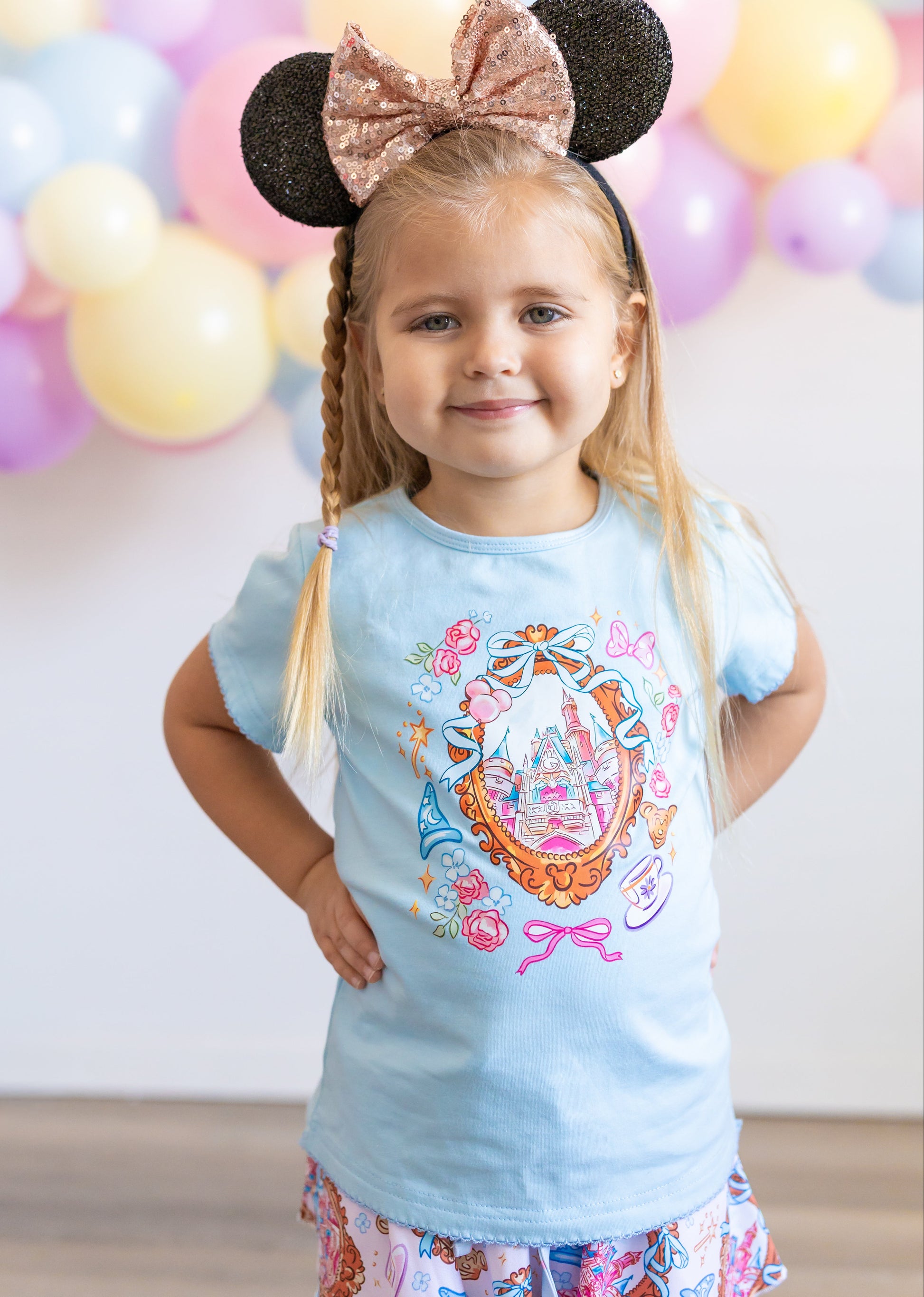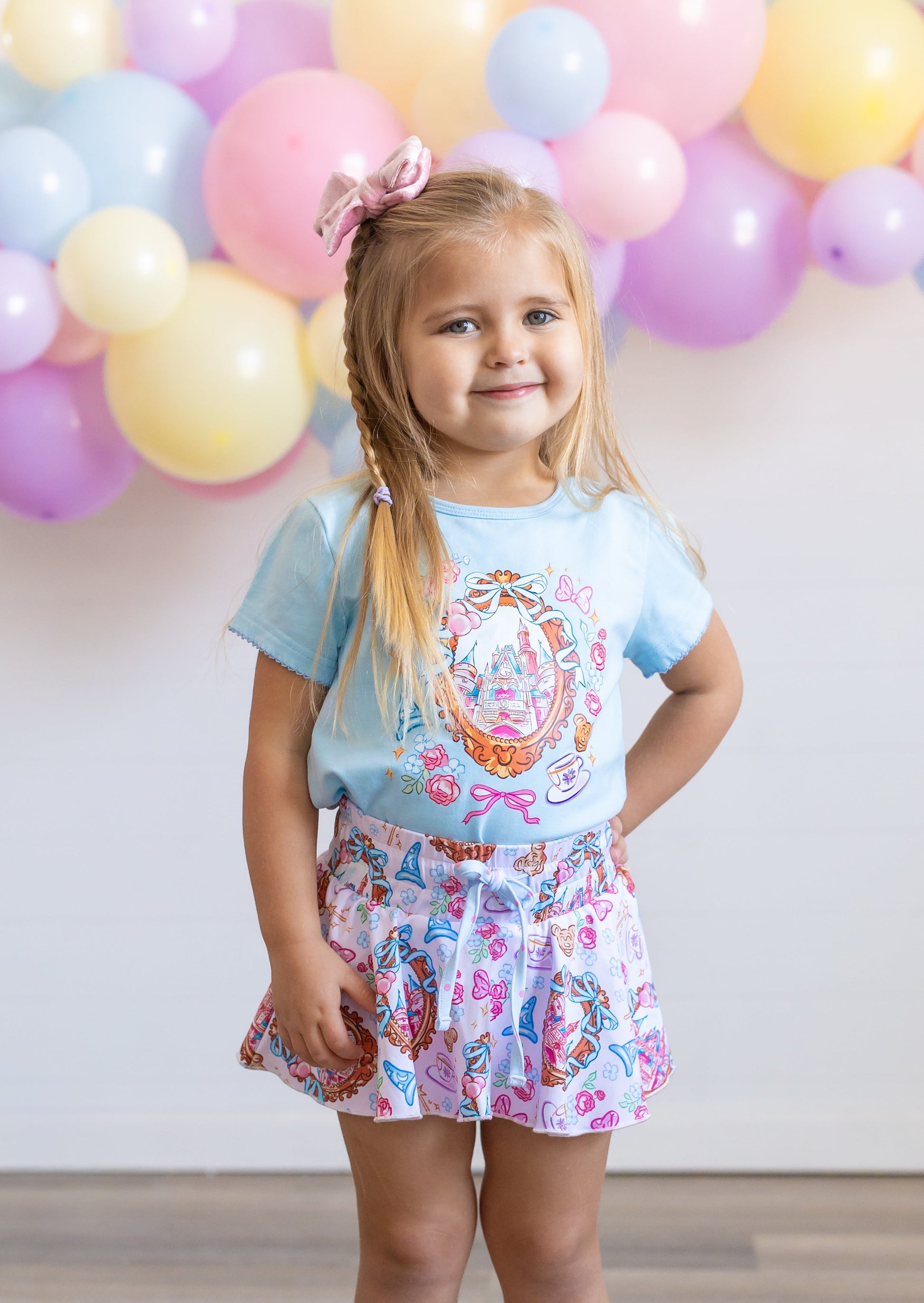 Enchant your wardrobe with this whimsical Magic Castle Tee! Crafted from soft, breathable cotton, this short-sleeve top features delicate picot stitching along the sleeves and hem for an extra touch of magic. The charming castle design pairs perfectly with our matching castle skort, creating a coordinated look that's pure fairy tale fun. Ideal for little dreamers who love all things magical and enchanting.