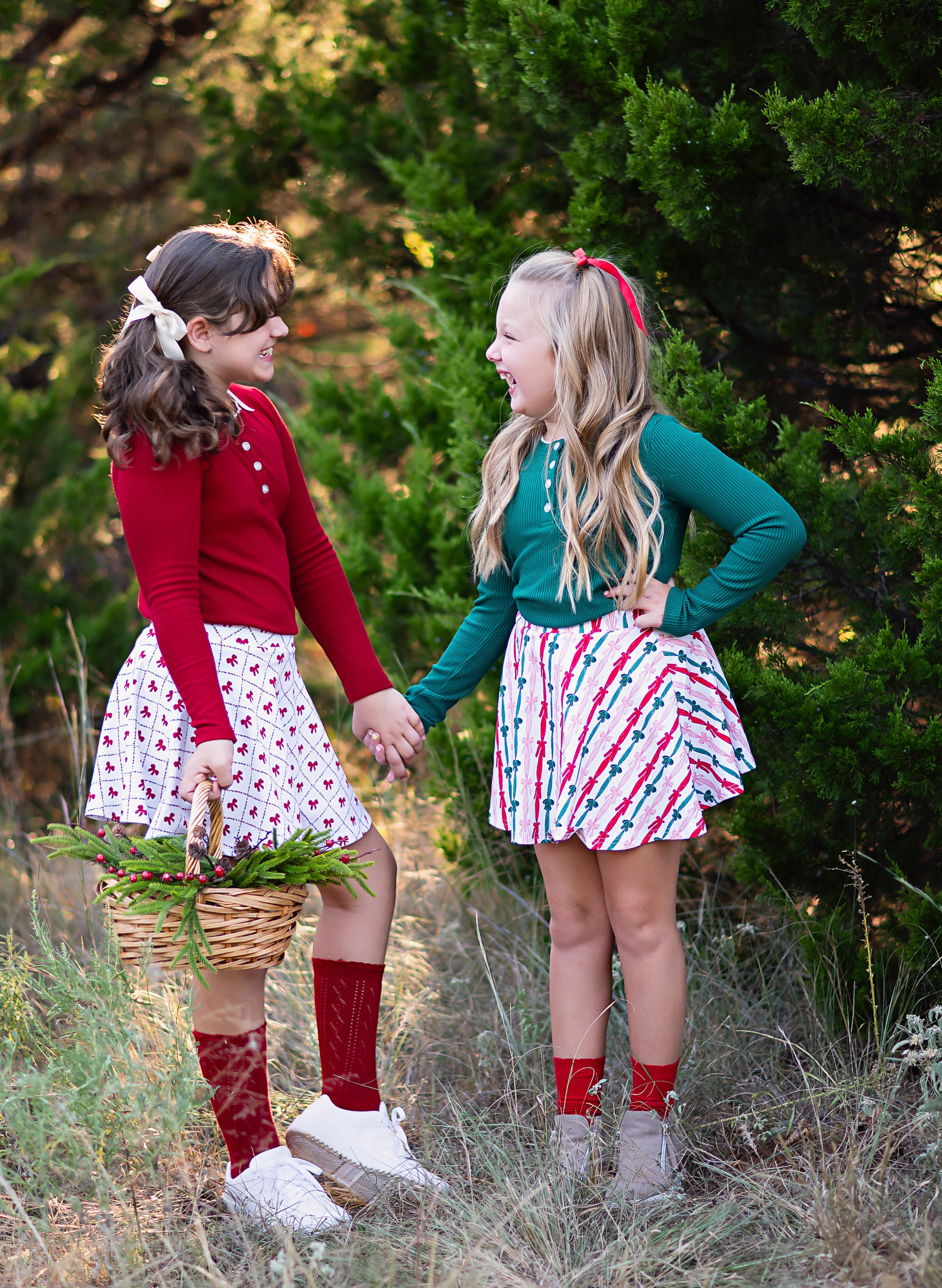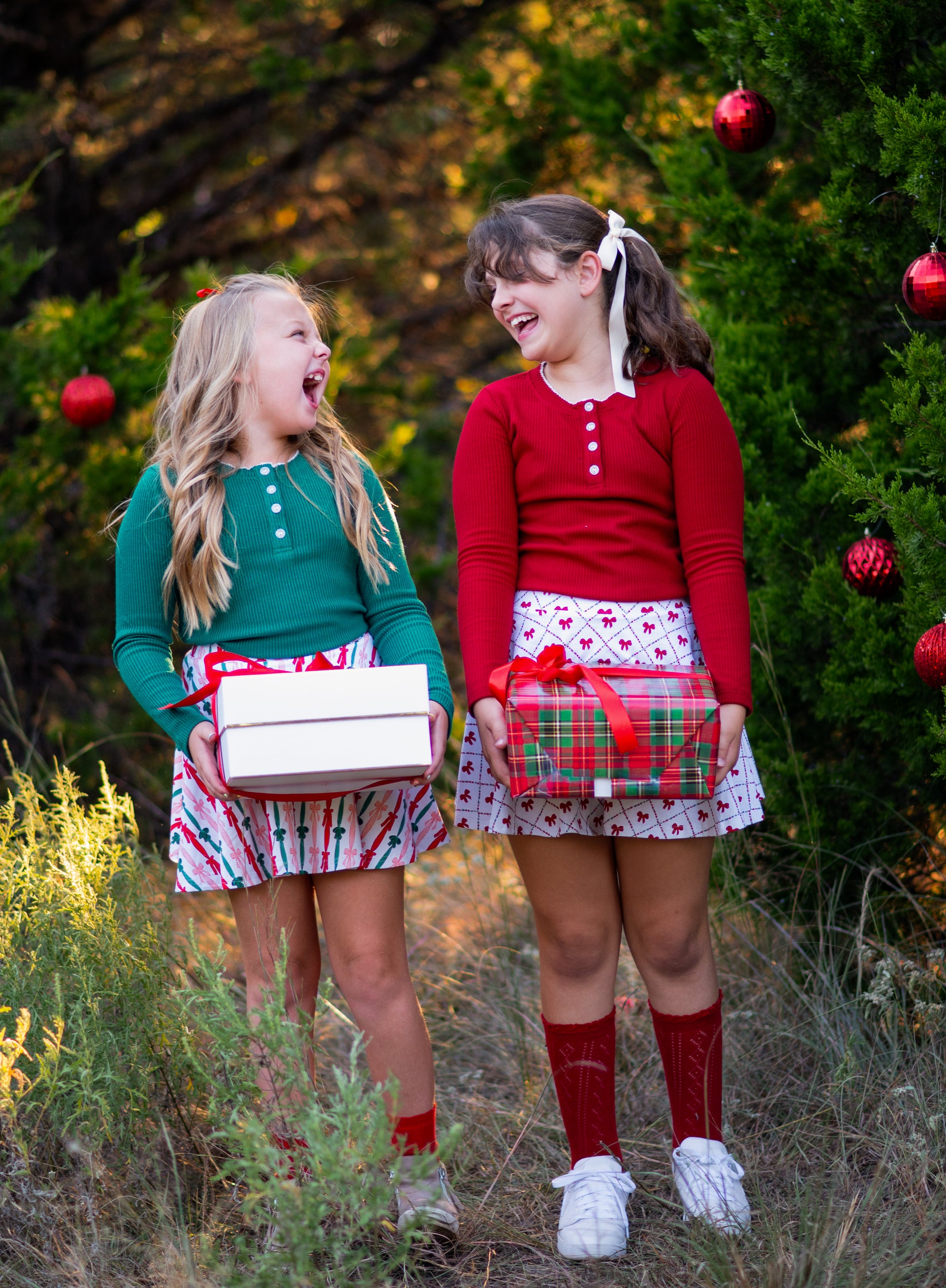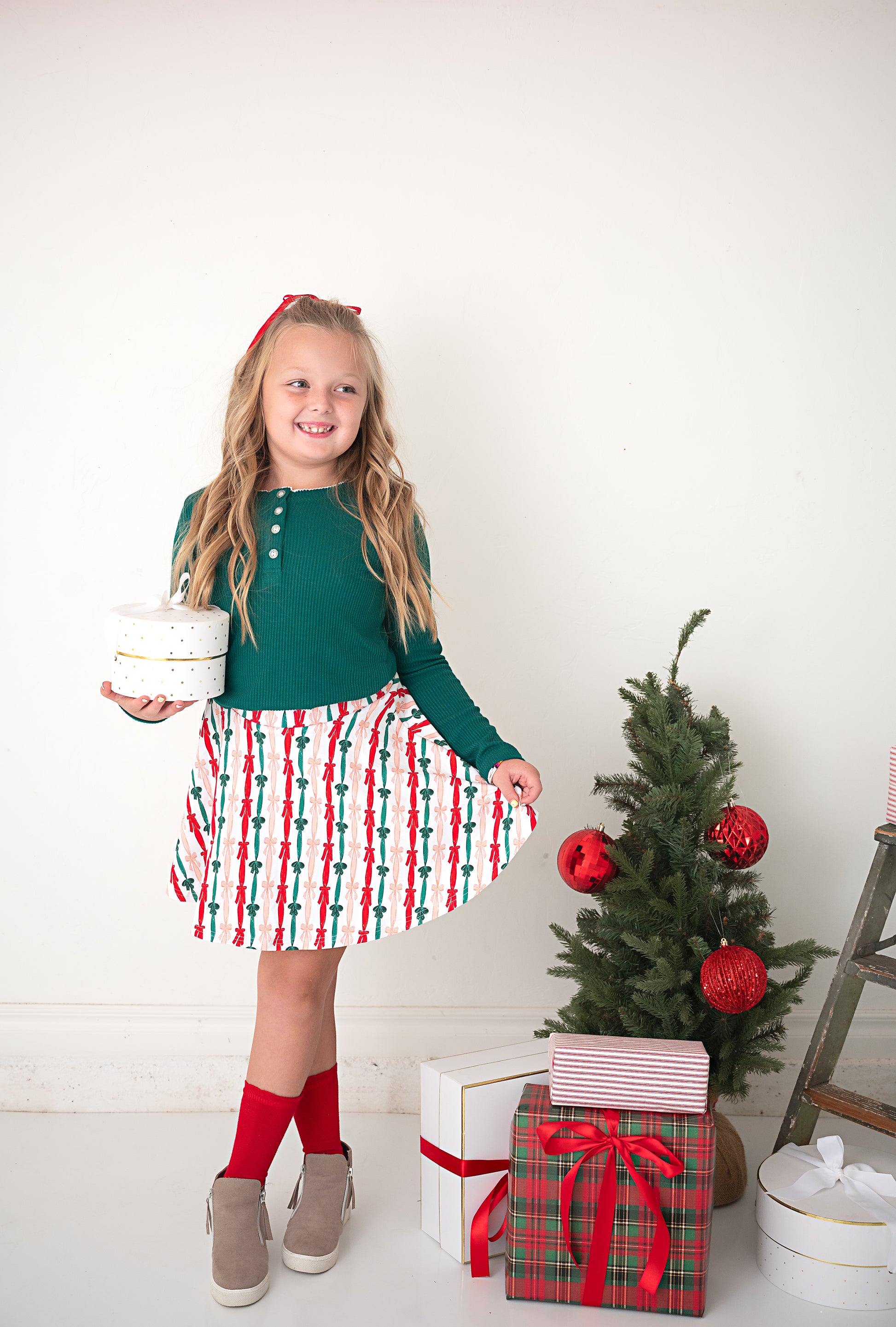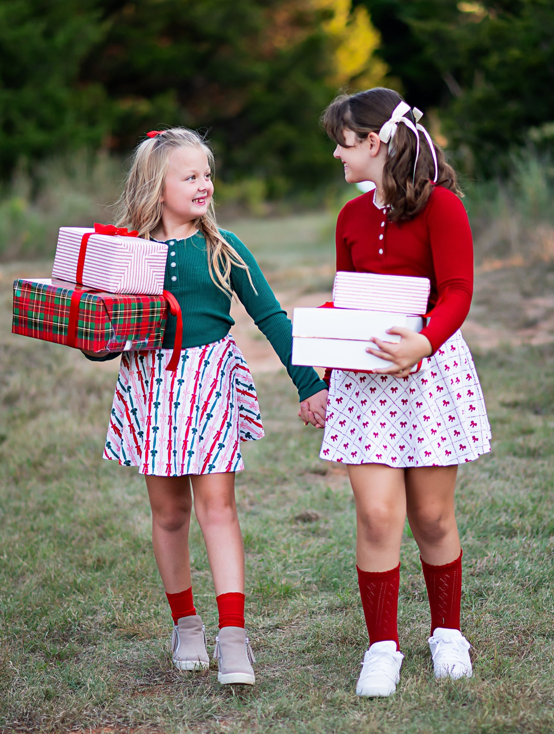 Celebrate the season with this soft, ribbed sweater tee in Wintergreen, featuring sparkly buttons and white trim. Perfect for mixing and matching with our Holiday Skorts for a festive, fun look!